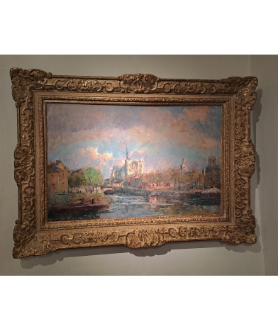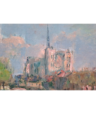 This unique work features a magnificent composition of France's largest cathedral, in Amiens. The painting is pure Impressionism, in which he plays with light and the waters of the Somme. The sky plays an equally important role, with the artist boldly introducing pink and green. The painting, in a perfect state of preservation, was laid down with speed and mastery. At 40, Lebourg was already at the peak of his talent.