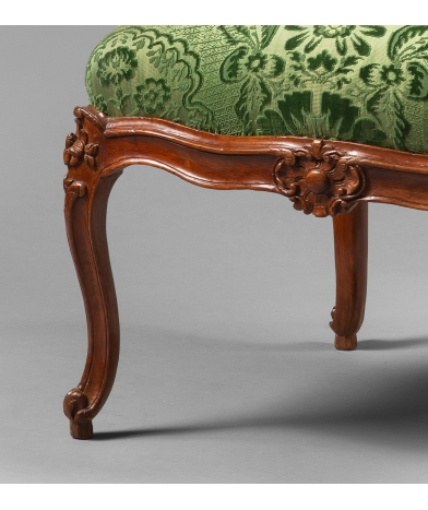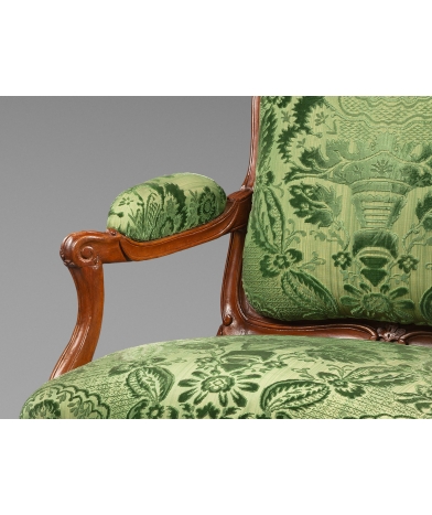 The line of this pair is very elegant, with particularly wide, deep moldings and taut curves reminiscent of the Regency period. The nervous carving of the decorative elements - acanthus leaves, cartouches, volutes and florets - was executed by a virtuoso hand. The motifs and quality of the cartouches are reminiscent of those of Heurtaut and Tilliard; the quality of the beech used is also remarkable, with a total absence of defects and a grain of exemplary finesse.
