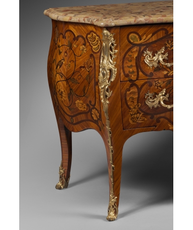 Mastered in 1761, Joseph Schmitz worked in Paris during the reign of Louis XV. The care taken in his production explains the rarity of his works, which he supervised alone. In his reference work, Pierre Kjelberg chose to reproduce our commode to testify to “the excellent craftsmanship of Joseph Schmitz's furniture, luxuriously decorated with marquetry of flowers, birds, trophies...”. Our piece of furniture can be compared with another remarkable commode by Joseph Schmitz in the Huntington Collection in San Marino, described by Pierre Kjelberg as “...decorated with a shimmering floral marquetry and a rich décor of rocaille and foliate bronzes forming a large central cartouche”.