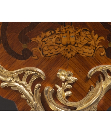 The rocaille bronze trim is chiselled to a high standard. And the gilding, most certainly original, is in rare condition. The bronze models are rich, but Joseph Schmitz wanted this relatively sober ornamentation for a piece of furniture of this level to leave its place to the exceptional marquetry. The marble top is a beautiful, carefully selected Aleppo Breche.