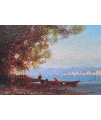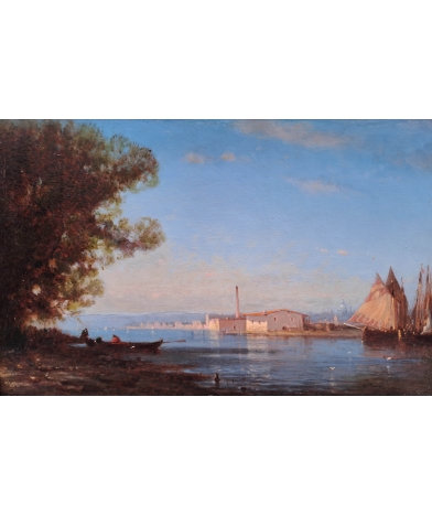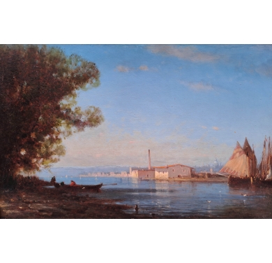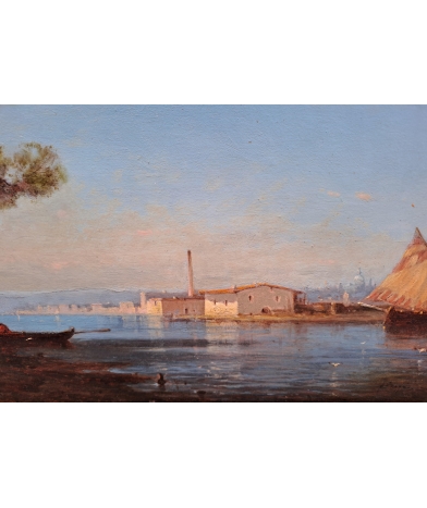This work is an oil on panel, preserved in perfect condition and presented in its original frame. It brings together all the characteristic elements of Félix Ziem's style: a seascape near Venice, the presence of the sea and boats, and discreet architecture in the background. The Alps can also be seen in the distance. The artist reveals his talent for playing with light, with subtle reflections on the water and an atmosphere that is both luminous and poetic, emblematic of his work.