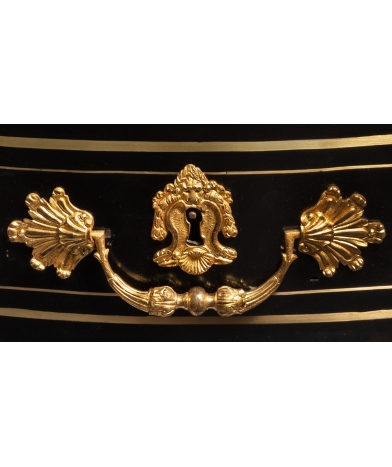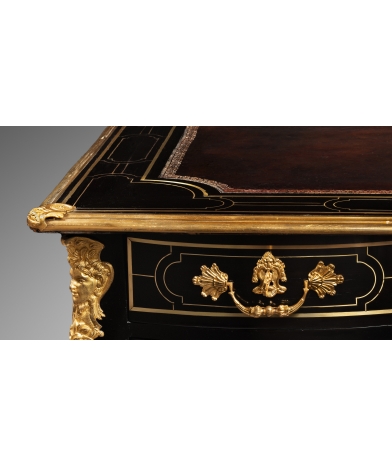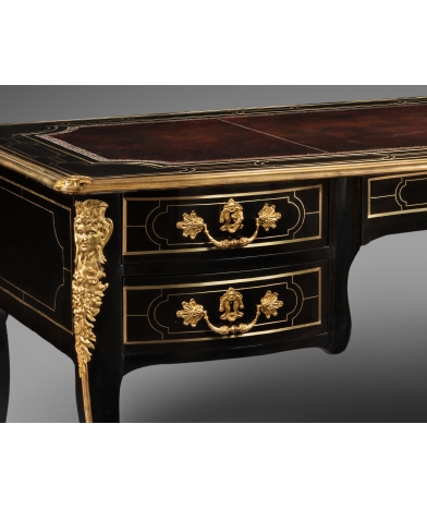 The bronze ornamentation is extensive, including superb female figures for the falls, beautiful mascarons at the corners of the ingot mold, sabots, and falling handles still fully anchored in the Louis XIV ornamental style. The chiseling is fine, with later gilding. Above, a top features a very beautiful antique leather, dark garnet in color, in particularly wide veneer reserves and with powerful spandrels. The inlay of the copper threads is precise, creating an elaborate geometric design that fits perfectly with the volumes and ornamentation of the bronzes. An important sign of quality is the recessed central drawer, which gives rhythm to the front and, at the same time, provides greater comfort for the user.