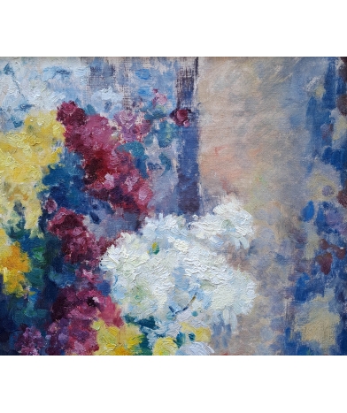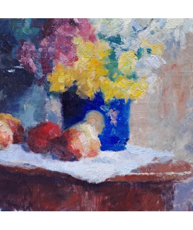 This magnificent still life is a rare work in more ways than one; here Haustrate gives us a subject with which he was unfamiliar, a rich composition of brightly colored peaches and bouquets on a pedestal table. This is truly a Fauve painting, even if it was produced in 1917, after the first years of the movement organized around Henri Matisse in the first decade of the twentieth century. This large-scale painting is notably luminous in Haustrate's oeuvre, which more often features compositions in more subdued colors. Here, Haustrate has used a swift, skilful touch, alternating a light, almost transparent treatment of the background with powerful impastos to highlight the flowers and fruit.