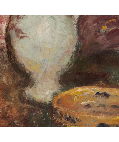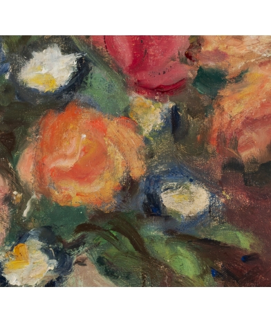 Our painting is a modernist composition of exceptional power. On a background in two distinct parts and opposite colors, a vase slightly off-center to the right stands out vividly. A natural colorist, the artist uses a very wide palette to elaborate this bouquet mixing orange, pink, white and blue.In the foreground, we note a tambourine, an object rarely represented by the artist. We can date this painting to the years 1925-1930. The raw, thick material is reminiscent of the tones of Fauvism, with which the artist remained strongly influenced even beyond the period of this artistic movement.