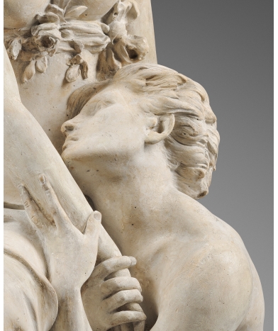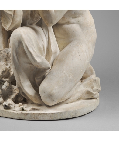 This plaster depicts a man kneeling at the foot of a woman. The postures of the two figures are particularly graceful. The man nestles his head against the young woman, who gazes at him tenderly. Their hands are intertwined. Attention to detail, the supple drapery, the curly hair, the floral elements and the turtledoves at their feet are all striking. This sculpture is a true tribute to love.