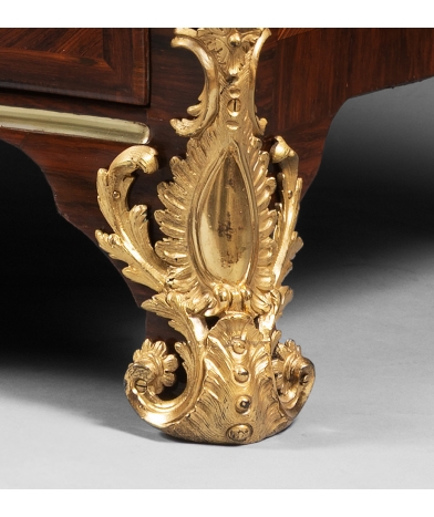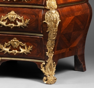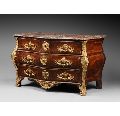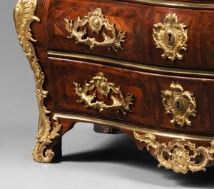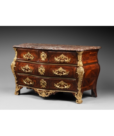I don't like the term “tomb chest” to describe our chest of drawers: this term covers too wide a range of chests of drawers, whose only common feature is the double curve of the front, both horizontal and vertical. The vast majority of “tomb chests” are pieces of furniture with straight sides, slightly curved fronts, almost identical dimensions, and unoriginal, poorly crafted bronze fittings. These chests were manufactured almost in series until 1760, and today they have lost much of their value. This decline in prices is all the more pronounced given that curved chests of drawers with marquetry have a high restoration cost, often well above their market value. For this type of chest of drawers, it is therefore only worth considering exceptional, rare pieces for which high-quality restoration really makes sense.