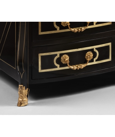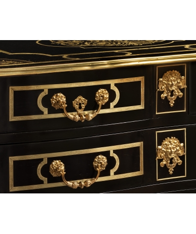This commode is a work made in Paris in the early years of the 18th century with sophisticated features and first-rate materials. Instead of the conventional three rows of drawers, this chest opens to 5 drawers in four rows. The rounded edges of the uprights are cut with particular care. The blackened pearwood veneered top and ebony veneered drawers are inlaid with large, finely engraved copper strips, forming a geometric pattern. On the top, five engraved arabesque motifs form part of the geometric pattern. On the sides and uprights, copper fillets are precisely inlaid to form a refined yet elegant design. The line of this commode is emphasized by a beautiful molded bronze molding that separates the top from the lower part.