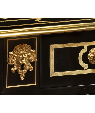 The bronze fittings perfectly respect the balance of space. The fine key escutcheons with their effigy of Bacchus, as well as the drop handles and clogs, have been brilliantly chiselled. The gilding has been reworked, as it was unfortunately very worn.