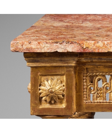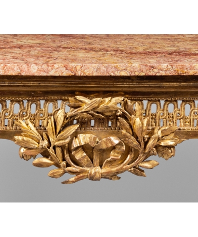 This rectangular console table is made of finely carved and gilded limewood. It is an important piece in the great French classical tradition of the late 18th century, with a return to straight lines, symmetry and the use of antique repertoire. Its large dimensions are consistent with a highly elaborate sculpture, a meticulous model and perfect balance. The client also wanted an exceptional marble from Italy, to break away from the cheap white or grey Saint Anne marbles of the period. This superb pink marble with yellow veins is infinitely rarer than the Aleppo breccias, which were so highly prized by important clients. It has been cleverly cut in the Italian style, with no molding or grooves; this straight cut is perfectly suited to the console's clean lines and absence of braces.