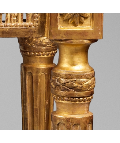 The console is mounted on four strong uprights that form the legs. Their large cross-section enabled the carpenter to create squared-off feet, and much more varied carving on the feet than the usual fluting: the fluting is in fact rudented and framed at the top by powerful rings adorned with friezes and pearls, and at the bottom by laurel leaves set on a ball. As for the belt, it is adorned with an openwork frieze and trimmed in the center with a wreath of laurel leaves joined by a ribbon.