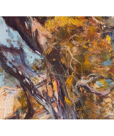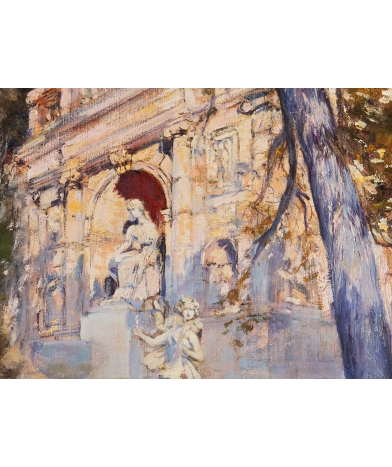 This work is a beautiful and large vertical painting. This is a rather rare format for Allègre which immerses us here in the sumptuous living environment of the French Riviera during the Belle Epoque. The artist very intelligently positioned his easel to give his painting perspective and a significant depth of field. He chose a sunny end of the day to deal with the shadows and the last rays of sun which give this astonishing volume to the trees and architectural elements. The thick pictorial material is carefully treated with a palette of colors that is as rich as it is harmonious. The painting is in perfect condition, on its original canvas and in its original frame.