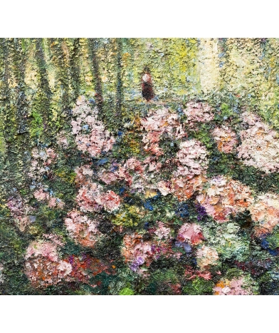 In the foreground, two huge shrubs covered with flowers stand out: by mobilizing a rich palette of reds, oranges, yellows, pinks, greens and whites, the artist shows us a flowering of a rare exuberance. The two shrubs are separated by a narrow strip of grass that guides the composition towards the following planes: the grass of the garden, the trees and the buildings partly lit by the sun. We are thus invited to follow this strip of grass and to slip between the flowers to enter this enchanted place at a very special time: daybreak. Thus, the main house is illuminated by the still raking light of the sun coming from the upper left side. A gap in the blue sky where light clouds are floating accentuates the luminosity of the scene. The gracefulness of the composition, which combines two lines that meet: the line sketched by the strip of grass that rises towards the center of the painting where the line constituted by the first rays of sunlight that descend along a diagonal converges.