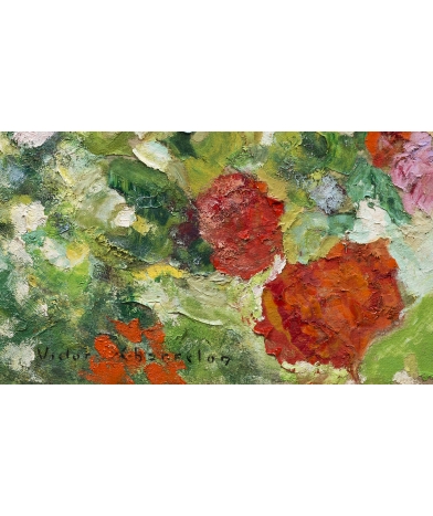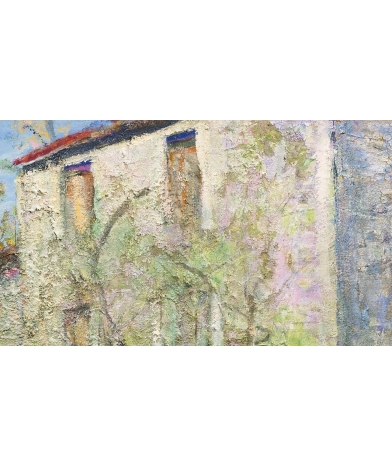 On a huge format, it is visible that the artist devoted a particularly large amount of time to depicting his property at the height of flowering. He worked meticulously, in full pate, applying up to a centimeter thick of pictorial material to the canvas. In this painting, the painted work of Victor Charreton becomes sculptural. A true explosion of pure colors, this work is absolutely amazing when we look at it with close-up shots: The representation of the flowers becomes almost abstract, and shows us the immense talent of this pioneering artist.