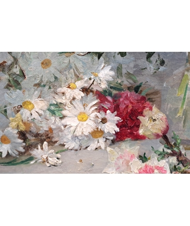 Notre tableau est une nature morte à la composition moderniste. Comme Georges Jeannin, Grivolas nous livre ici un « Jeté de fleurs » à côté d’un vase plus conventionnel. Le fond et l’entablement volontairement épurés, ainsi que le vase transparent, sont voulus pour mettre en valeur les seuls éléments végétaux. L’éclairage et les ombres sont maitrisés avec brio, et la disposition des fleurs sur la table est savamment réfléchie pour donner l’impression de la préparation d’un bouquet. La volonté de l’artiste est bien de donner une vision spontanée de la nature et de rompre avec l’académisme de l’Epoque.