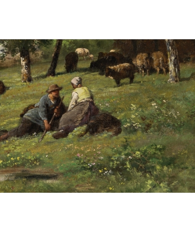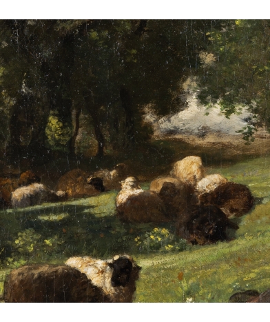 ? Notre tableau est une œuvre rare de Charles Jacque et de très grande qualité. On notera la douceur de la représentation des personnages, lesquels sont relativement rares dans les tableaux de cet artiste. Le peintre a opté ici pour un format plus grand que ceux qu’il utilise généralement afin de produire une œuvre dont la composition est particulièrement riche : présence d’un nombre important de moutons, certains situés au premier plan alors que d’autres sont plus éloignés, luxuriance de la végétation aux multiples tonalités de vert, admirable effet de perspective et, dans la partie supérieure, un ciel bleu parcouru de nuages clairs qui contribue au caractère lumineux de la scène représentée. Dans cette œuvre forte et réaliste, Charles Jacque est très proche d’un autre grand maitre du naturalisme, Jean-François Millet.