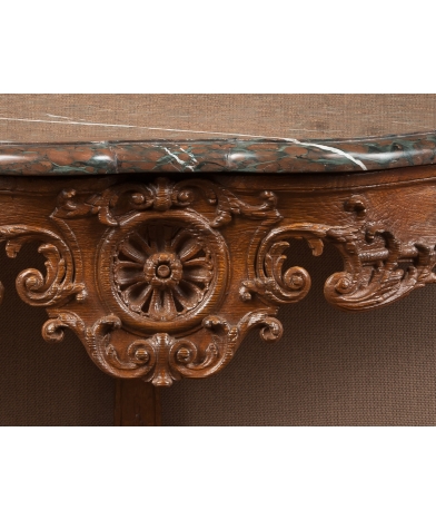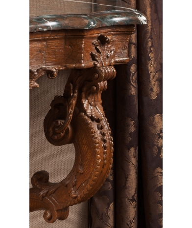 Il s’agit d’un travail parisien exécuté dans le premier quart du 18ème siècle. Son élégance repose sur la justesse et l’équilibre de ses proportions. La sculpture est abondante sans être outrecuidante. Ce type de console où l’influence du règne de Louis XIV est encore bien visible, est beaucoup plus rare que les consoles Louis XV qui furent fabriquées en très grand nombre à partir de 1740.