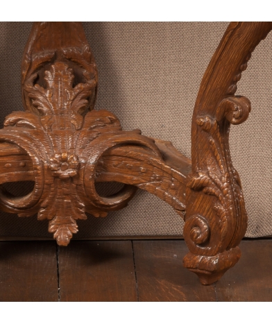 Console d’applique en chêne naturel richement sculptée. Sa ceinture est ornée en son centre d’une rosace ajourée entourée de volutes feuillagées. Elle repose sur deux pieds en volutes affrontées, sculptés de coquilles, volutes et torsades. Les pieds sont reliés par une entretoise arquée et ornée d’un motif végétal qui est reliée à la ceinture par un montant également sculpté.