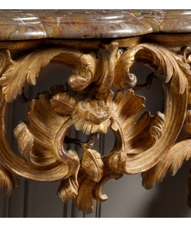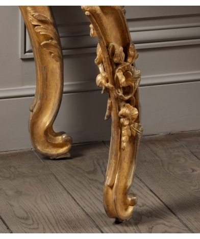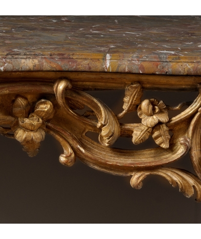Cette superbe console aux dimensions imposantes est parfaitement équilibrée. Il s’agit d’un travail Rocaille, exécuté en plein milieu du 18ème siècle, avec une ornementation de volutes et d’éléments végétaux. La sculpture est d’une grande abondance, vigoureuse et précise, que ce soit sur les quatre pieds, la ceinture avant et les côtés.