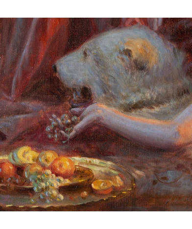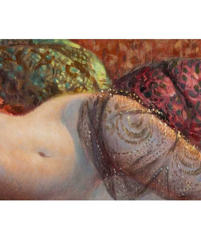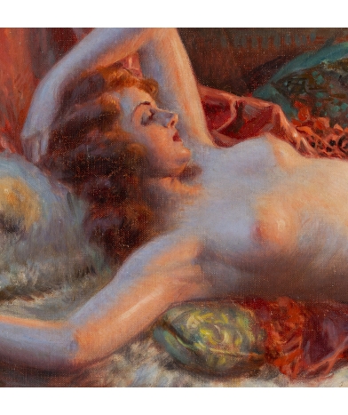 Ce tableau de dimension importante est une scène au décor orientaliste. Si Enjolras nous a laissé une profusion de portraits féminins dans des intérieurs bourgeois, l’artiste a également produit quelques scènes orientalistes, aussi rares que très appréciées. Ce superbe nu a été réalisé avec une attention particulière à un riche décor, des tentures orientales, de la peau d’ours et de la très jolie composition de fruits sur un plateau. La posture alanguie et la carnation de la jeune femme étendue sont remarquables. Les effets d’ombres et de lumières sur le corps témoignent de l’immense talent de Enjolras, talent malheureusement sous-estimé à cause d’une trop grande quantité d’œuvres réalisées quasiment en série et à l’intérêt relatif.