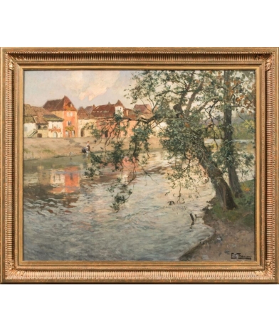 Cette œuvre de Frits Thaulow nous livre le sujet pour lequel l’artiste est mondialement connu comme « The Master of Rivers and Streams from Norway ». Cette nature mouvante qui plaisant tant à l’artiste est ici parfaitement composée, avec un arbre aux feuillages mouvants au travers duquel l’eau de la rivière frissonne. La scène se trouve devant le village de Bretenoux en Quercy, à la limite du Lot et de la Corrèze. Thaulow a réalisé de tableau magnifique en 1903 lors de son voyage en Dordogne, juste avant son exposition à la galerie Georges Petit. L’huile sur sa toile d’origine est en parfait état, sans aucune restauration.