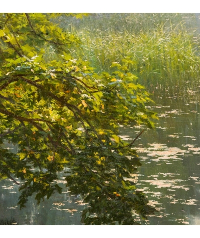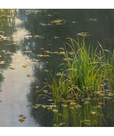 Exceptionnel par sa taille et plus encore par sa qualité, ce tableau constitue l’un des chefs d’œuvre connus de l’artiste. Il s’agit de l’huile sur toile que Biva présenta à Paris au salon de 1910 sous le numéro 206. Henri Biva y déploie tout son talent de peintre académique et naturaliste. Les salons étaient, ne l’oublions pas, des concours, et les œuvres présentées étaient d’un niveau exceptionnel: Les jeunes artistes y jouaient leur carrière. Pour ceux dont la notoriété n’était plus à faire, les salons demeuraient l’occasion de développer encore leur renommée et ils y exposaient « hors concours » ce qui est le cas de ce tableau. On notera l’équilibre parfait de la composition, le soin particulier apporté au traitement de la végétation et de ses reflets sur l’eau de l’étang, la remarquable capacité de l’artiste à représenter les variations constantes et perceptibles de la lumière. Cette œuvre est dans un état absolument parfait. Elle a été dévernie et simplement revernie pour retrouver son éclat d’origine. Aucun accident n’est à signaler, et le tableau se trouve encore sur sa toile d’origine. Le cadre est de grande qualité, il est également d’origine et parfaitement restauré.