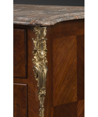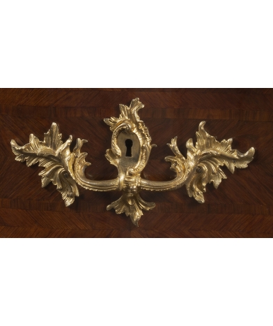 Cette commode ouvre à cinq tiroirs sur trois rangs, car un petit tiroir est caché entre les deux tiroirs supérieurs. Les montants sont « pincés », affutant la ligne du meuble. Les côtés s’évasent légèrement vers l’extérieur, ce qui en 1730 représentait une grande nouveauté rompant avec les côtés encore droit de la Régence.
