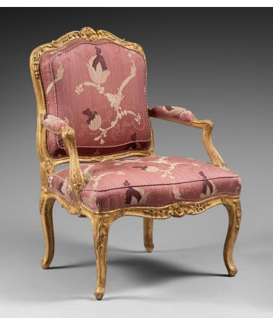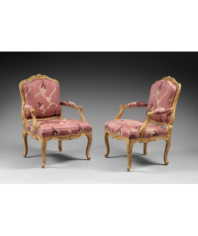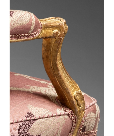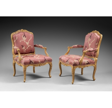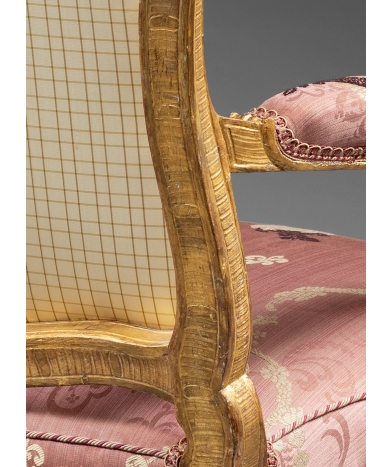 Ces six fauteuils à dossiers plats, dits à la Reine, sont en hêtre finement sculpté et dorés à la feuille. La sculpture abondante est composée de volutes feuillagées, de grenades éclatées, de feuilles d’acanthe, et d’agrafes. La belle cambrure des pieds et des traverses, le dossier bien épaulé, et le répertoire ornemental nous oriente vers un travail de l’ainé des Cresson, dynastie d’ébénistes parmi les meilleurs de la première moitié du 18ème siècle. Les assises larges, parfaitement proportionnées avec la forme des dossiers, donnent à ces sièges une ligne remarquable.