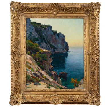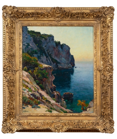 Notre tableau est une œuvre importante, de par une taille imposante, un sujet emblématique, et un traitement très abouti tout en matière. Jean-Baptiste Olive affectionnait particulièrement cette calanque d’En Vau : il a réalisé cette vue au moins cinq fois, avec toujours le même angle, mais à des heures différentes de la journée. Comme Claude Monet avec ses nymphéas, Jean-Baptiste Olive, en observateur méticuleux, se passionna pour les effets de lumière au travers de l’eau, avec différents éclairages du soleil. Notre tableau est très proche de l’œuvre du musée des beaux-arts de Toulon, légèrement plus grande. Il est possible que notre tableau en soit une œuvre préparatoire. L’état de cette œuvre, sur sa toile d’origine, est excellent. Les couleurs puissantes sont indemnes, la matière picturale intacte. Pour ce tableau, Jean-Baptiste Olive commanda un cadre exceptionnel, que nous venons de faire restaurer en retrouvant une grande partie de la dorure à la feuille originelle.