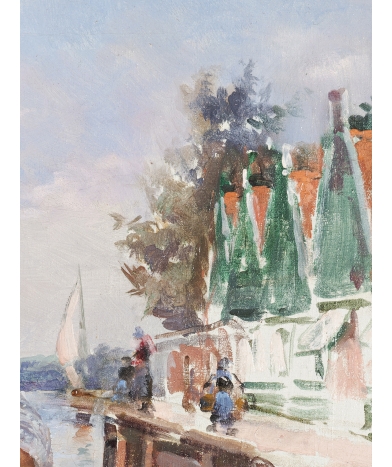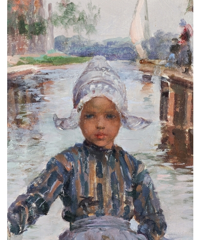 Nous datons l’œuvre vers 1905. Cette huile sur toile est traitée avec maitrise et rapidité. La touche vive et espacée procure un sentiment de légèreté comme s’il s’agissait d’une aquarelle. Pourtant la matière bien épaisse confère aux couleurs vives une vie étonnante à cette scène intime ou l’on devine la relation des deux personnages. La lumière est magnifiquement rendue, ses effets donnent du mouvement à l’eau et au tablier de la petite fille. L’enfant, plus petit, est le personnage principal. Très légèrement décentrée vers la droite, la jolie figure se trouve à la croisée des lignes de fuite de la composition : la scène apparait au spectateur complètement naturelle, alors qu’elle a été étudiée pour donner la vision d’une vie idyllique. Sur sa toile d’origine, le tableau est en parfait état. Les couleurs ont conservé leur éclat d’origine. L’œuvre se trouve dans un très beau cadre en bois noirci de style hollandais, qui replace parfaitement ce tableau dans son contexte.