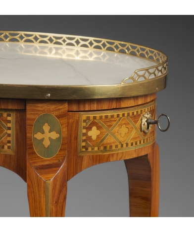 Le ceinture présente une belle marqueterie « à la reine », et ouvre latéralement par un tiroir. En façade, une tirette garnie d’un cuir est dissimulée sous le plateau supérieur. Le dessus du plateau ovale est en marbre blanc, ceint d’une galerie de bronze finement ajourée et dorée.