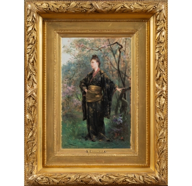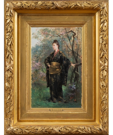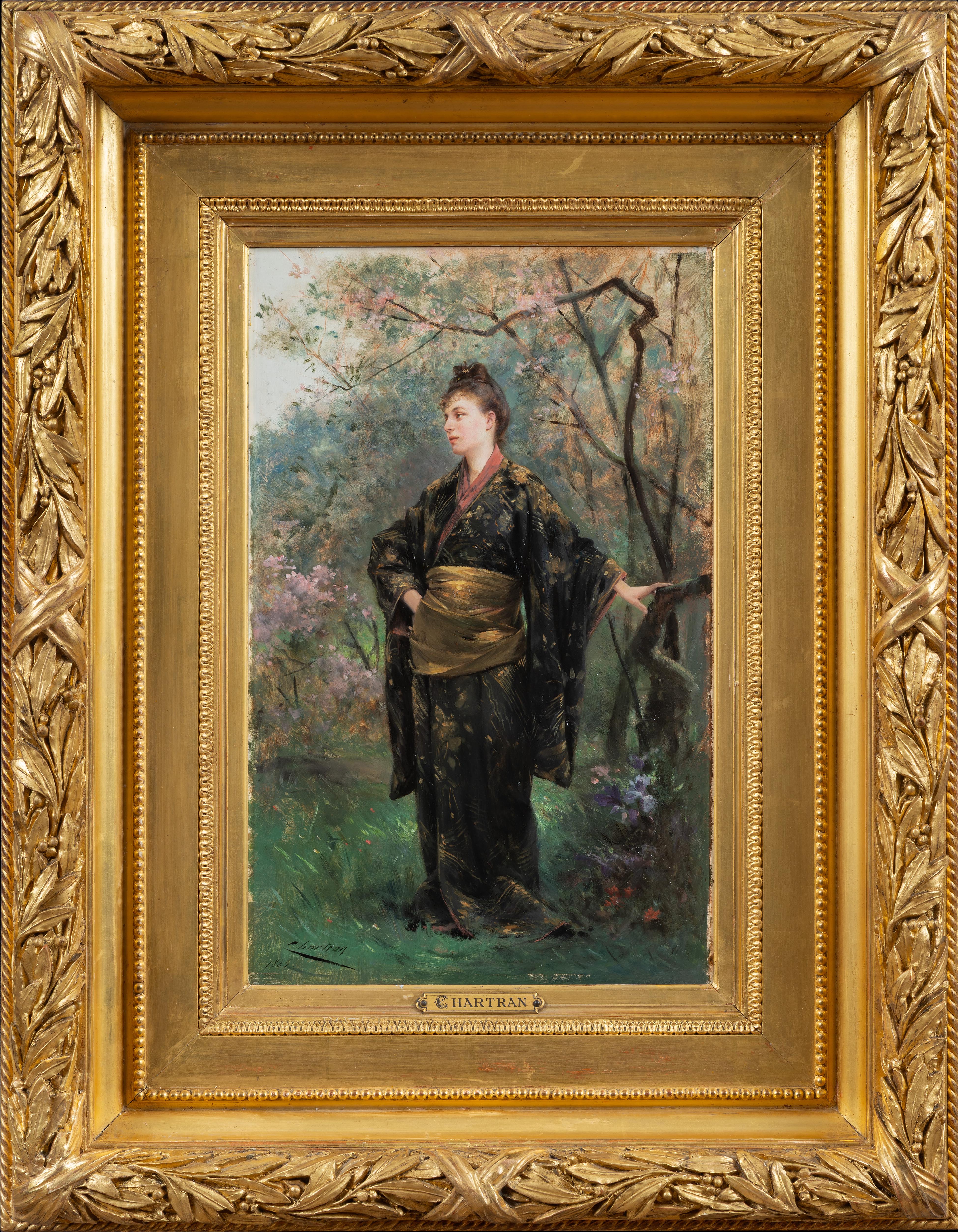 Cette œuvre Jeune femme en Kimono,est d’une élégance infinie. Le visage de la jeune femme, sa posture et son habit, traduisent le raffinement extrême de la haute société française et Américaine à la fin du 19ème siècle. Le magnifique kimono, aux plis souples, répond au décor végétal et japonisant, très en vue en 1880. A l’âge de 35ans, Chartran peint ce sublime portrait alors qu’il commence à être fort connu : Ses moyens financiers lui permettent de commander pour ce tableau un cadre tout à fait exceptionnel. A décor de lauriers, cet important cadre est enrichi par des rangs de perles, de cordages et de rais de cœurs. Finement sculpté et doré à la feuille, il vient d’être restauré. Le tableau, huile sur un panneau de bois biseauté, est dans un état parfait, simplement déverni et reverni. Les couleurs sont intactes et aucun accident n’est à signaler.