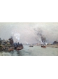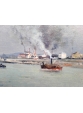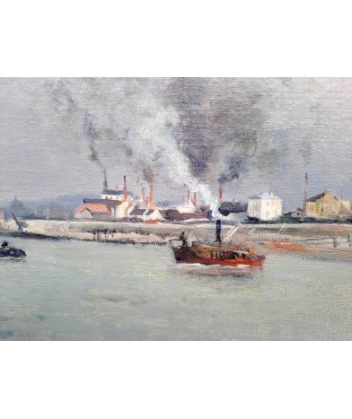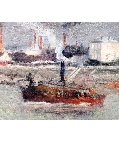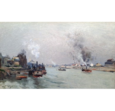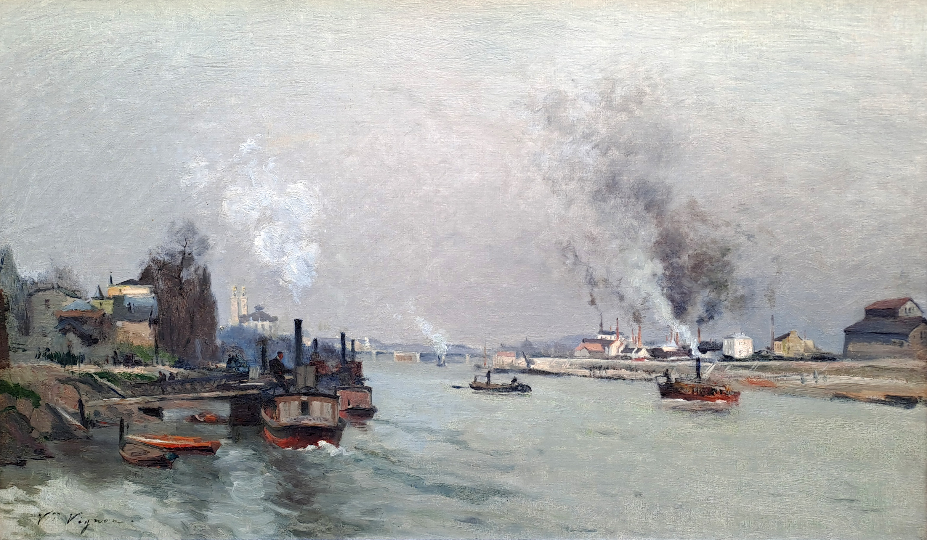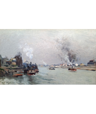 Notre tableau est une œuvre réalisé par Victor Vignon alors qu’il n’a que 33ans. Le sujet, Paris et la Seine en 1880, donne evidement à cette œuvre une place importante dans sa production. Comme il aimait le faire, Vignon peint ici un ciel chargé ; la lumière qui traverse par endroits la couche de nuages est admirablement traitée. La matière picturale est épaisse, la touche est impressionniste, notamment avec le traitement de l’eau mouvante dans le sillage des bateaux. La composition semble classique, mais si on y regarde de près, le choix du point de vue permet de produire une perspective très intéressante.